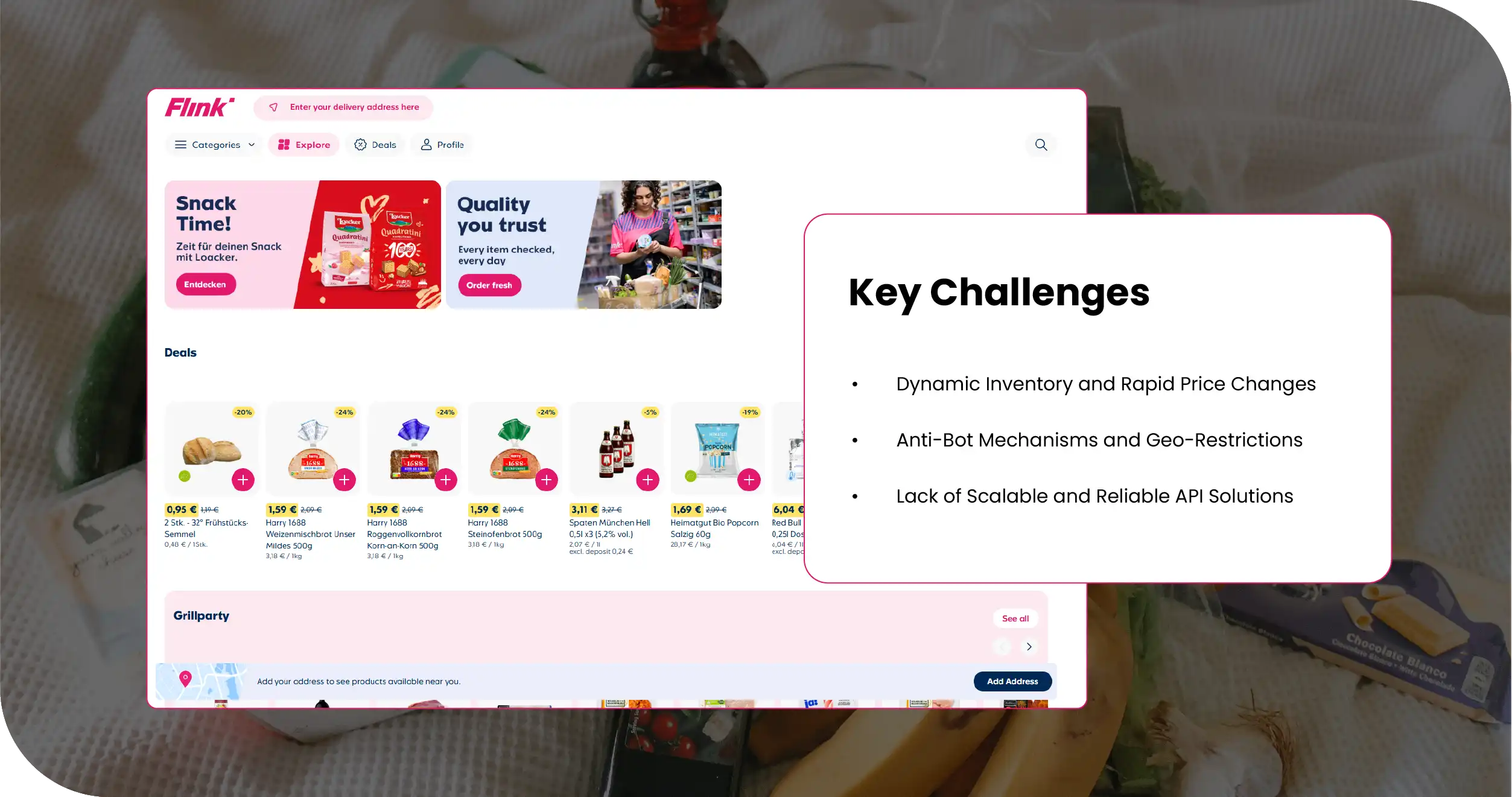 Anti-Bot Mechanisms and Geo-Restrictions: The client struggled to Scrape Flink Quick Commerce Data due to advanced anti-scraping technologies and region-specific content variations across German cities.