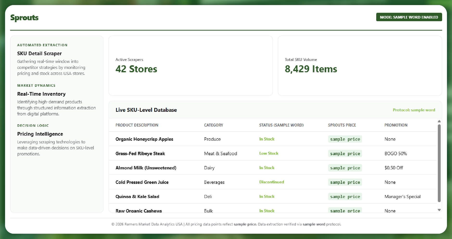 - Real-Time Pricing and Product Insights : Monitor Sprouts Farmers Market product prices and availability across all locations to stay competitive and adjust pricing strategies instantly.